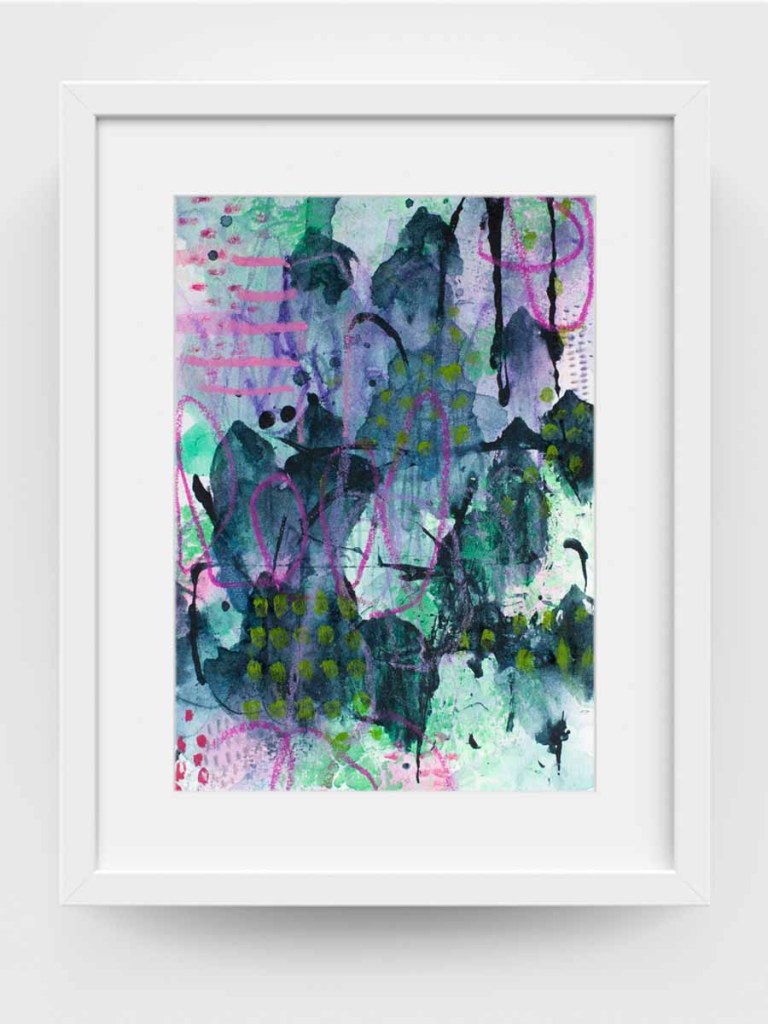 Acrylic, watercolour, ink and oil pastels on watercolour paper.