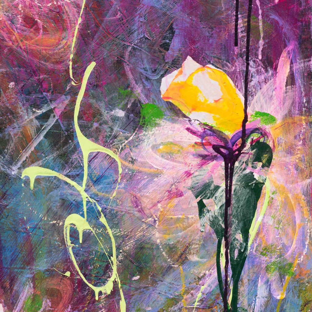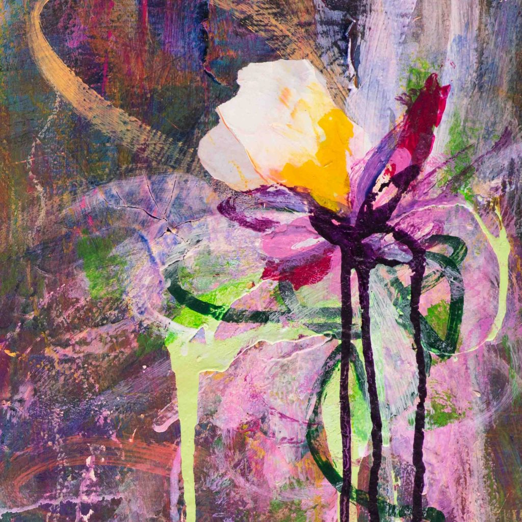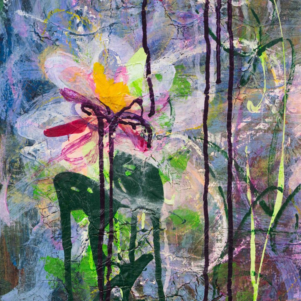 Mixed Media: acrylic, ink, pastels and collage on hand made canvas.